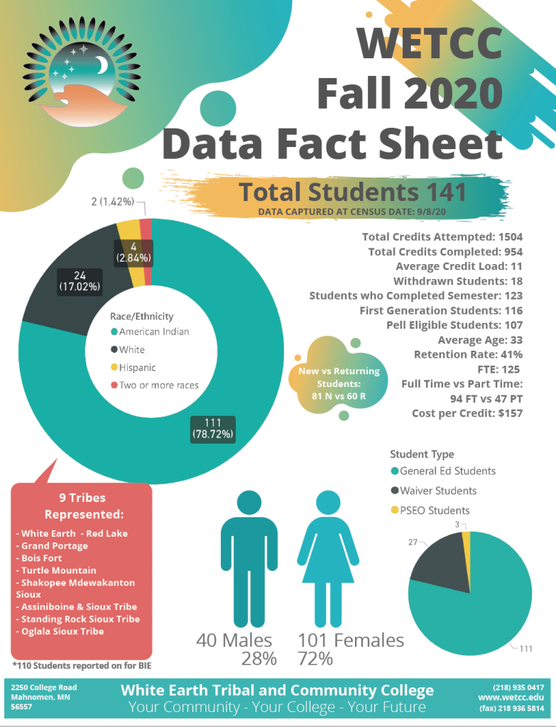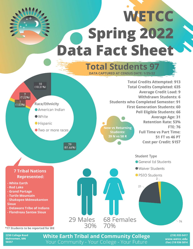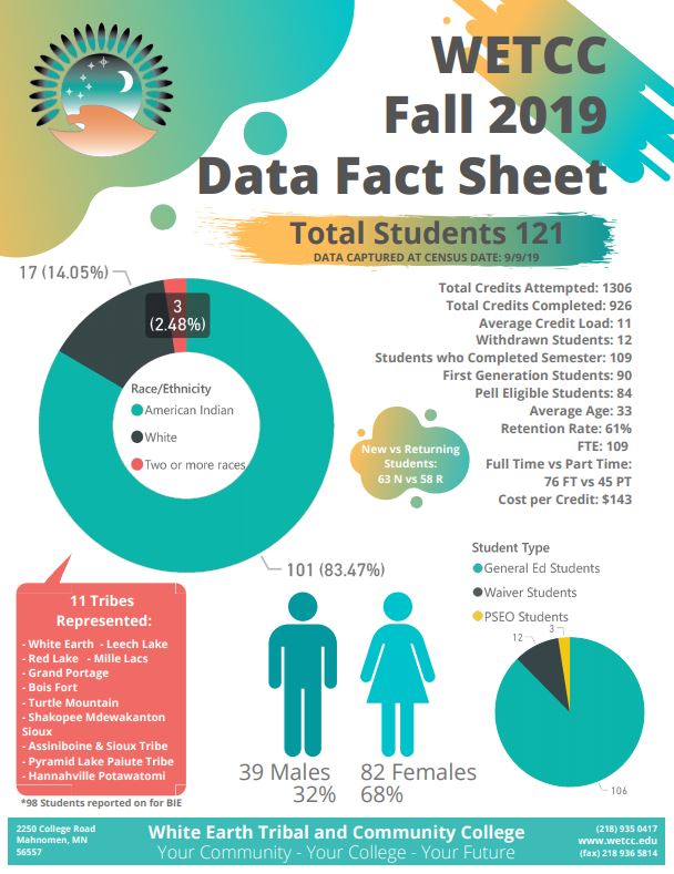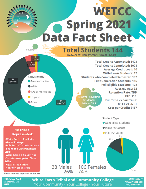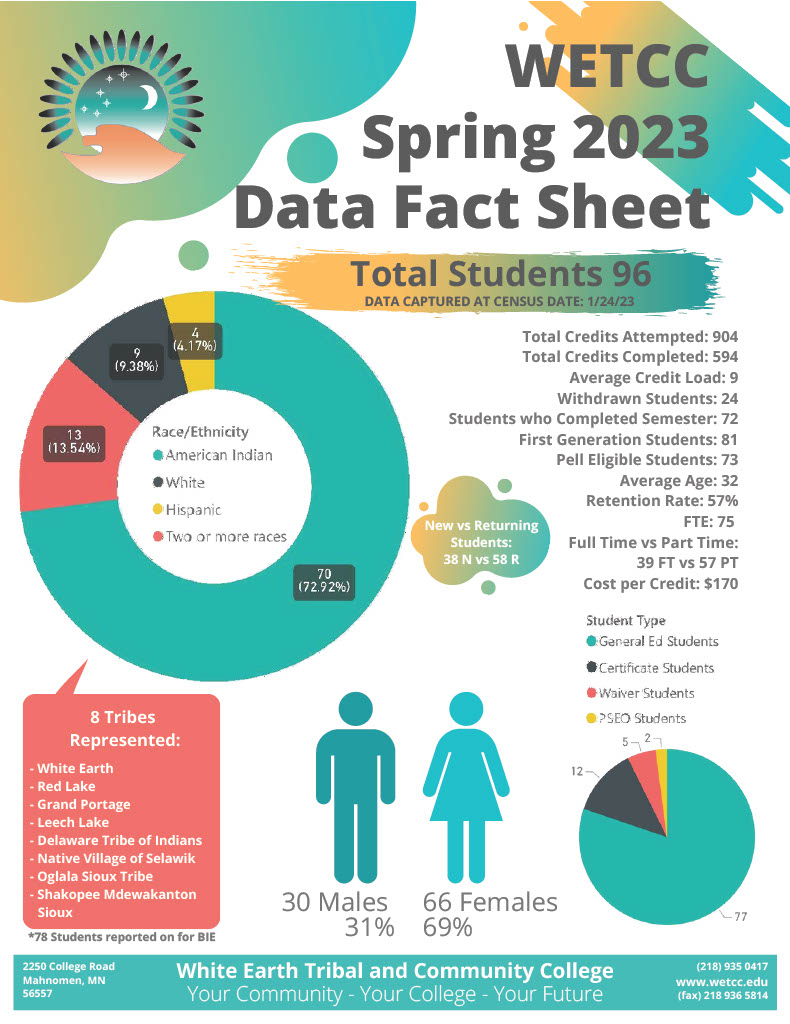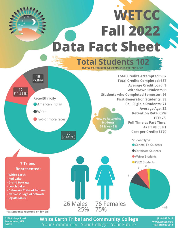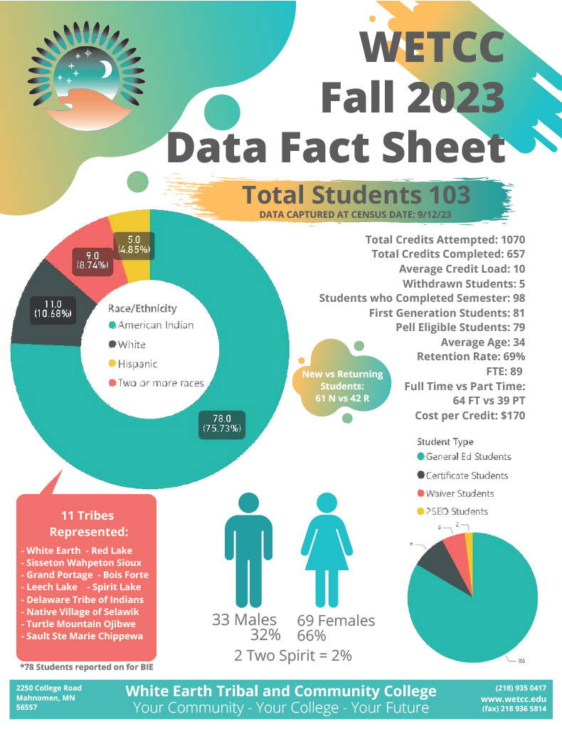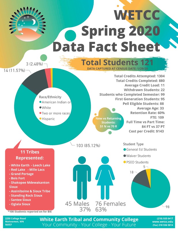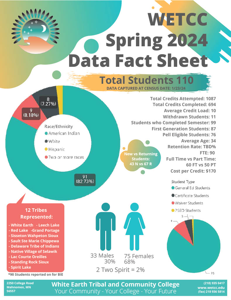 White Earth Tribal and Community College (WETCC) is a two-year educational institution focused on providing quality academics rooted in the cultural heritage of the White Earth Nation. Located Mahnomen, MN, the college offers a range of Associate Degrees, Certificate Programs, and Continuing Education courses designed to meet the evolving needs of our community. Accredited by Higher Learning Commission, WETCC is committed to maintaining high educational standards while honoring traditional and cultural values. Our student body is diverse, comprising individuals of various backgrounds who are united in their pursuit of educational and personal growth. For more detailed statistics, such as enrollment numbers, graduation rates, and program offerings, please see below.